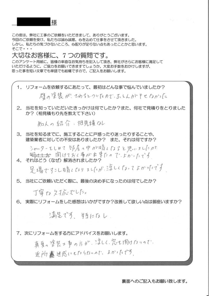 「壁に触れると手につく状態で、ふとんも干せない」という日常のお悩みから工事をご検討されたとのこと、今回の塗装でそのストレスが解消されたようで、私たちもとても嬉しく思っております。